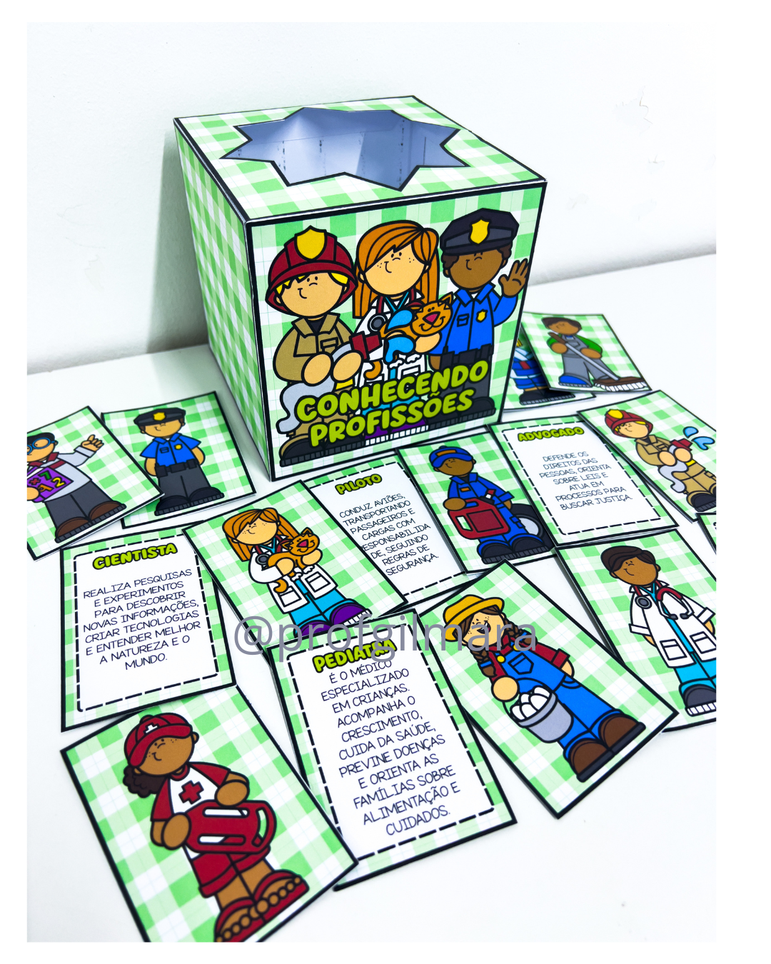 O material contém uma caixa organizadora e 15 fichas ilustradas, cada uma com uma profissão e sua respectiva