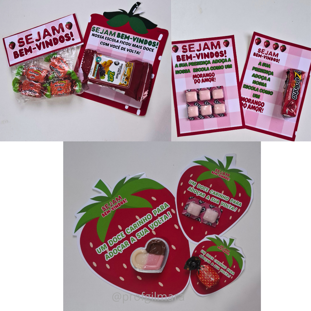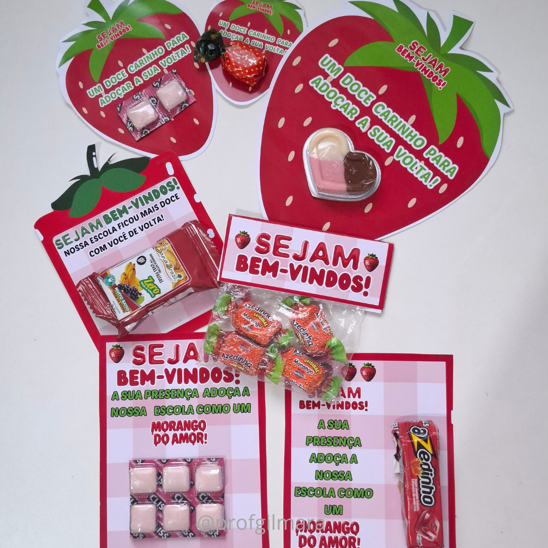 -Cartão retangular em dois formatos com a frase: “Sejam bem-vindos! A sua presença adoça a nossa escola como um morango do amor!”