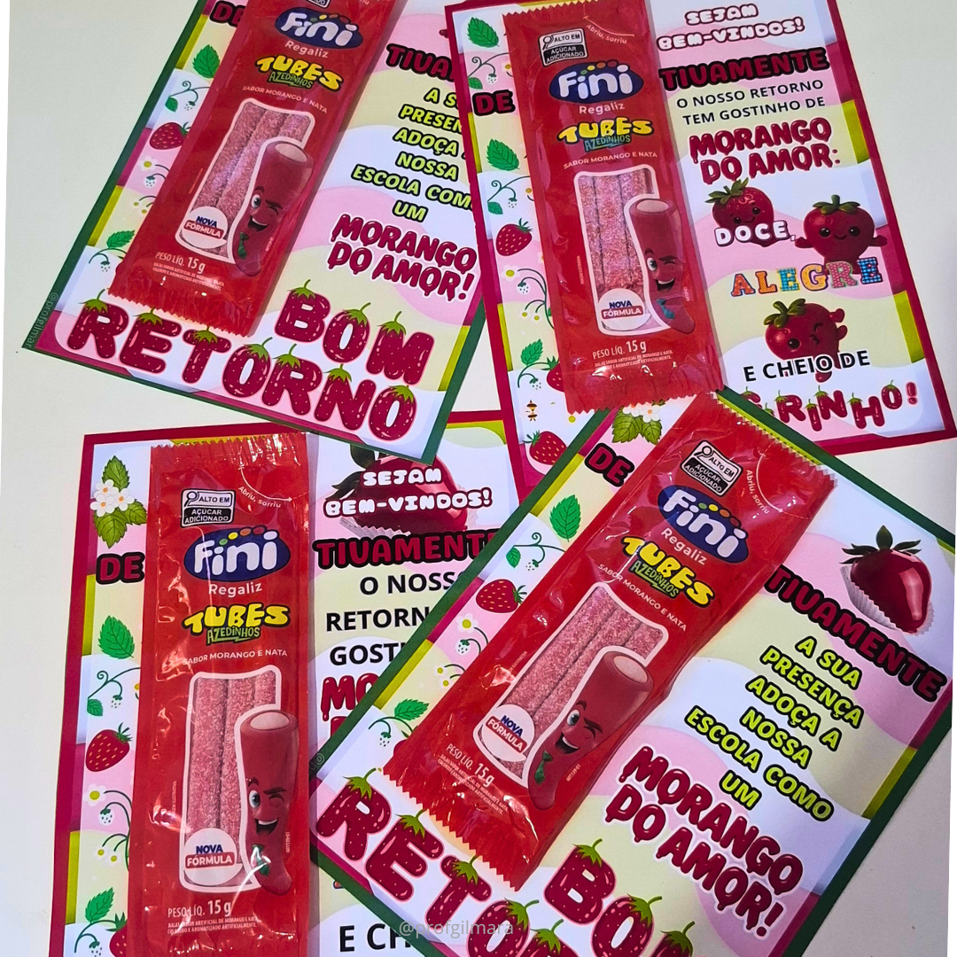 -Cartão morango quadrado com a frase: “Sejam bem-vindos! Nossa escola ficou mais doce com você de volta!”