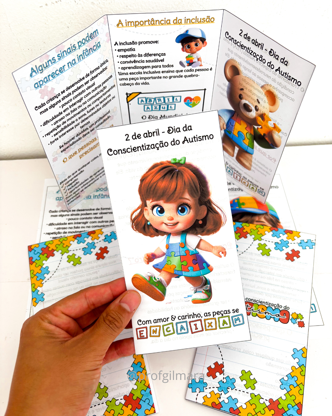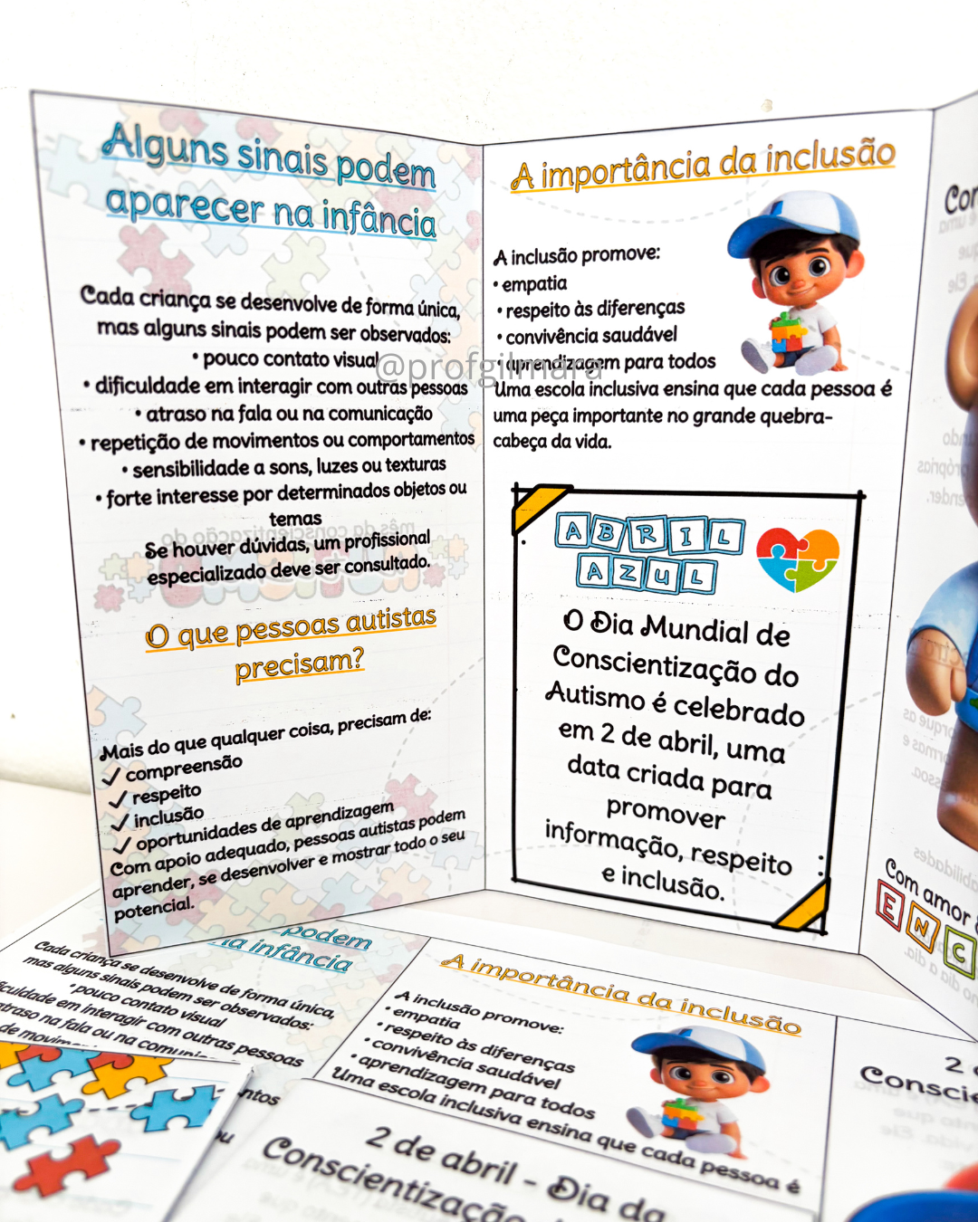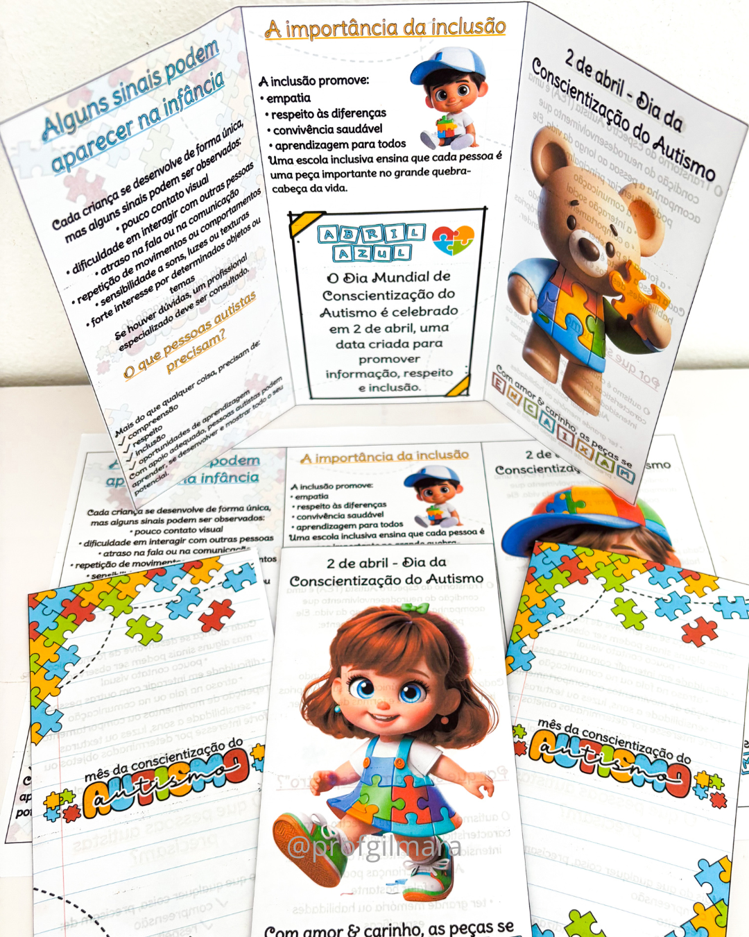 Pensando nisso, preparei 3 modelos de folders para o mês da Conscientização do Autismo, perfeitos para enviar às famílias ou trabalhar esse tema com a comunidade escolar. O material traz informações claras sobre sinais que podem aparecer na infância, a importância da inclusão e o significado do dia 2 de abril, ajudando a ampliar o olhar sobre o autismo de forma acessível e acolhedora.