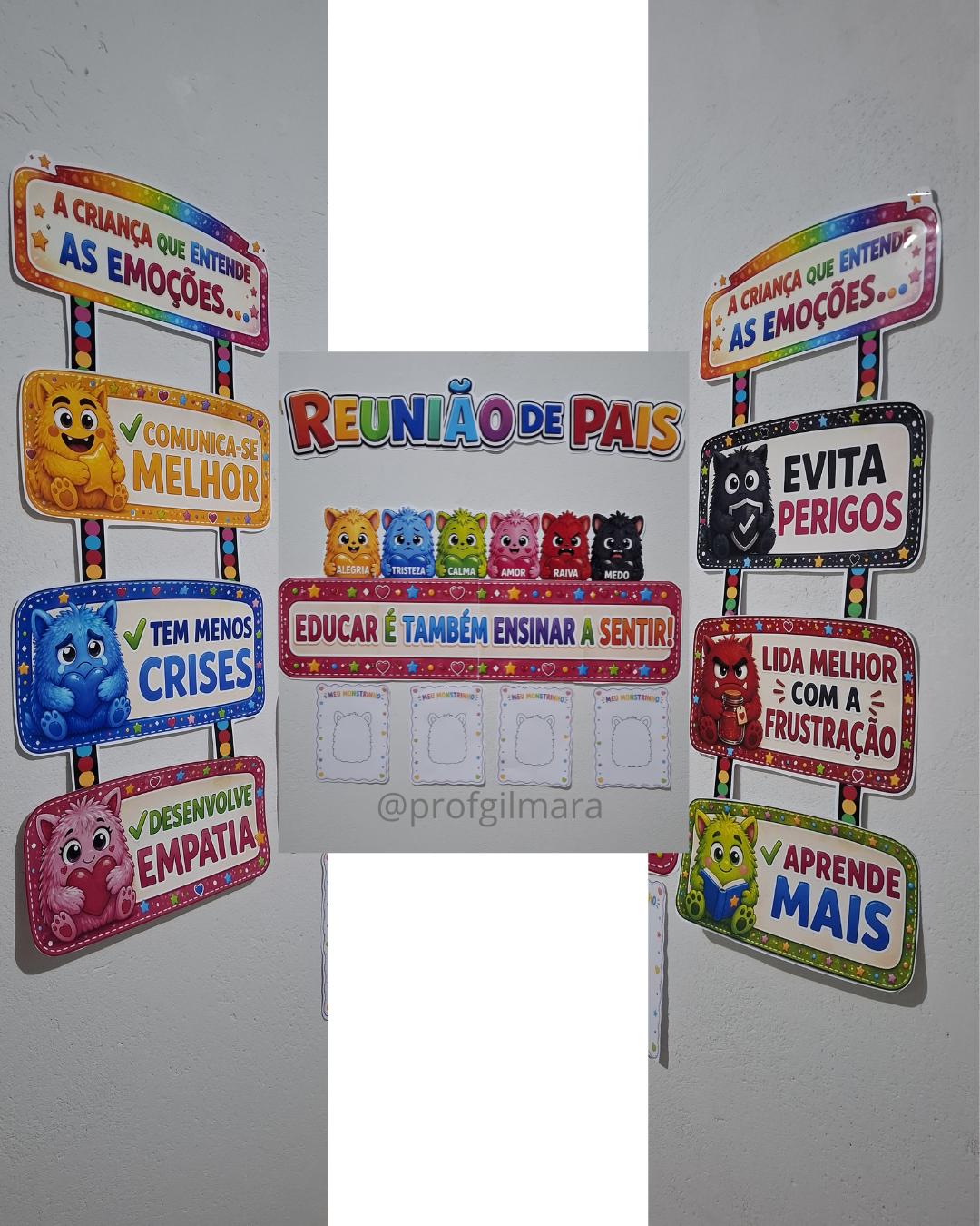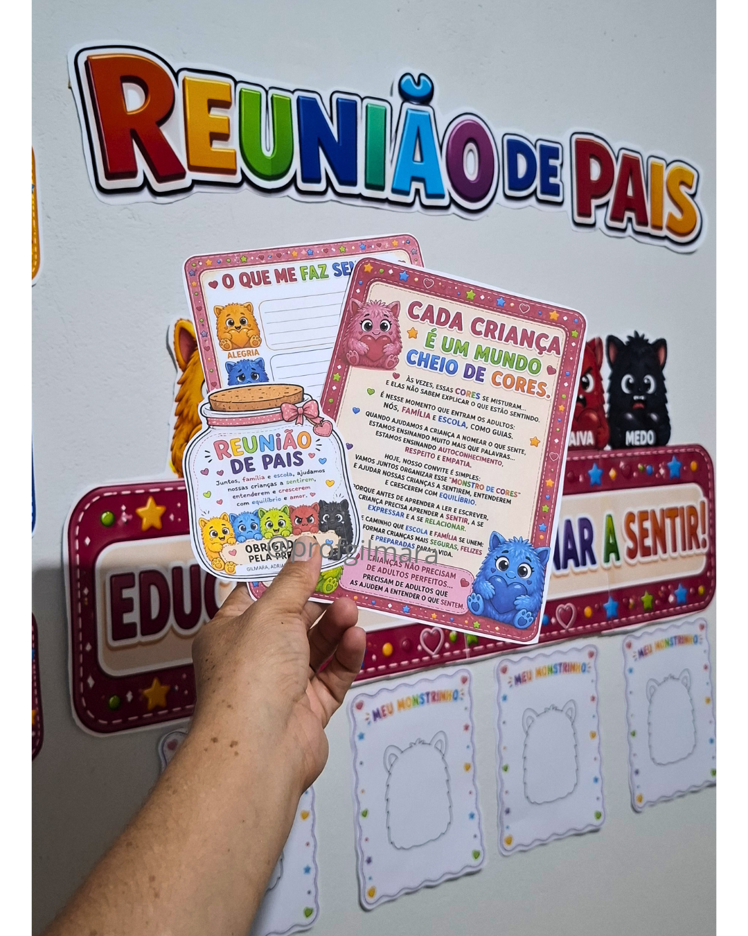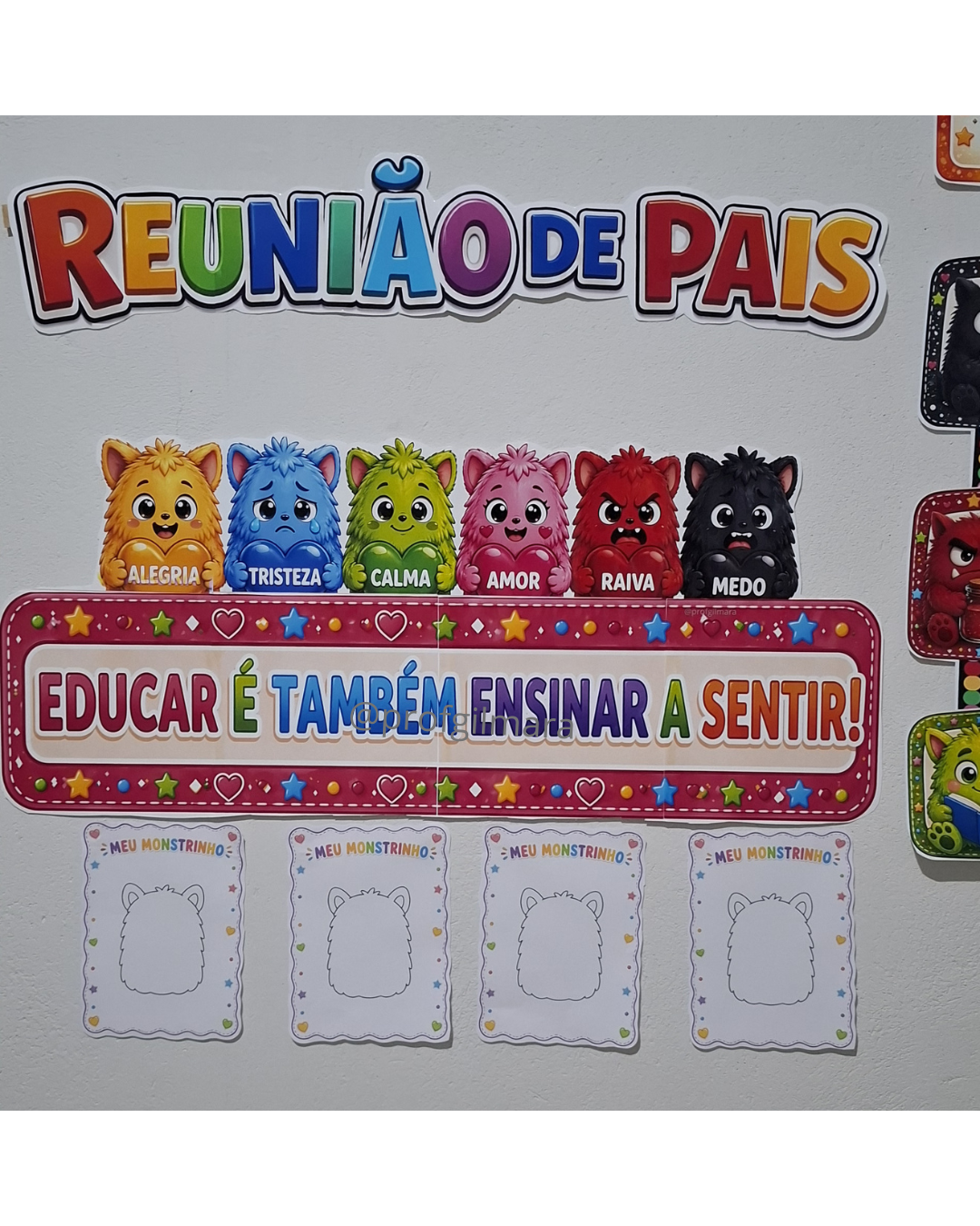 -Painel com o título reunião de pais, monstrinhos com os nomes das emoções(alegria, tristeza, calma, amor, raiva e medo), quadrinhos com importância da criança entender as próprias emoções.