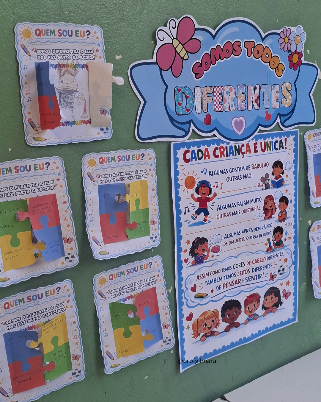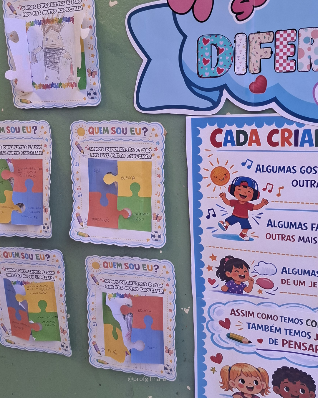 Um painel interativo onde explora-se as diferenças. Você escreve em cada quebra cabeça algo que deseje explorar como: cor dos olhos, cor dos cabelos, brincadeira preferida, brinquedo preferido, cor preferida, comida predileta e etc. (escrever a mão).